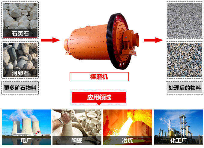 应用范围:棒磨机广泛使用于耐材、化工、冶金、玻璃等行业及对磨后成品均匀度要求比较高的研磨作业,近年来还用于建筑用砂的制砂行业等。