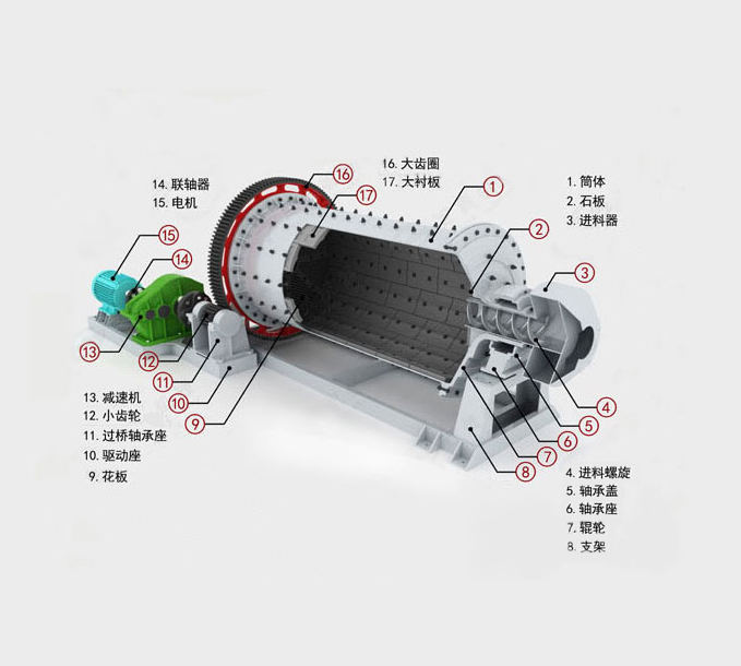 球磨机由给料部、出料部、回转部、传动部(减速机、小传动齿轮、电机、电控)等主要部分组成。中空轴采用铸钢件,内衬可拆换,回转大齿轮采用铸件滚齿加工,筒体内镶有耐磨衬板,具有良好的耐磨性,本机运转平稳,性能可靠,根据物料及排矿方式,可选择干式球磨机和湿式球磨机。